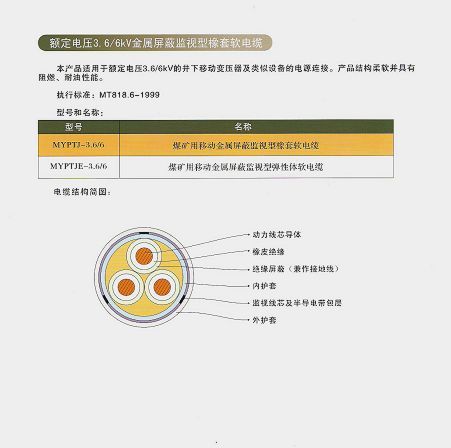 YJLV33表示聚乙烯絕緣鋁芯聚氯乙烯護(hù)套細(xì)鋼絲鎧裝聚乙烯外護(hù)套;YJV22聚氯乙烯護(hù)套銅芯電纜。又如,MYPTJ礦用高壓屏蔽主電源線—3.6/6 3*35+3*16/3+3*2.5 表示礦用移動屏蔽監(jiān)視橡套電纜,額定電壓為3.6KV/6KV,三芯動力線、每芯截面為35mm2,一芯接地線、芯線截面為16mm2,三芯監(jiān)視線、每芯截面為2.5mm2。